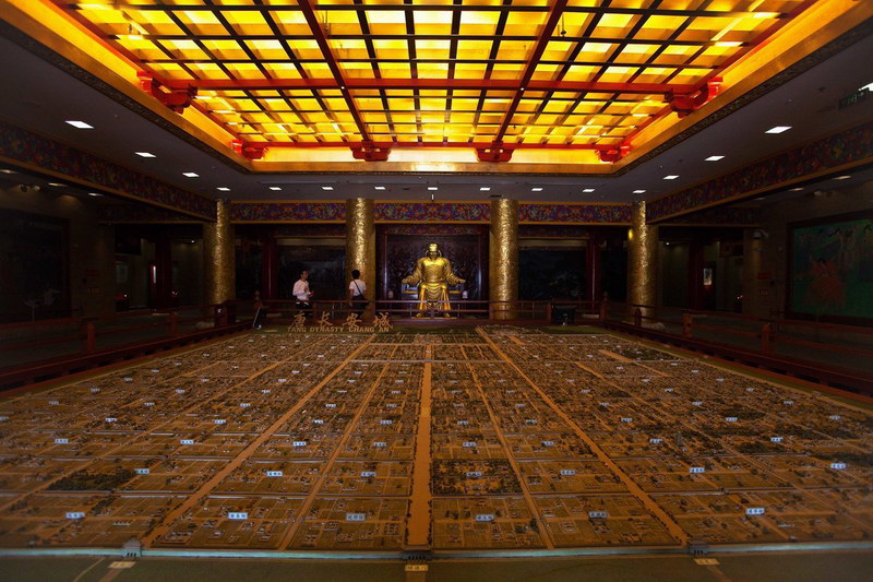 唐長安城立體沙盤便位于該樓的一層大廳位置,長8.55m,寬7.35m,還原了唐長安城“百千家似圍棋局,十二街如種菜畦”的格局,是紫云樓重要的展出項目之一。沙盤的三面是三塊電動升降幕,每塊電動幕面積為8m*3m。三塊幕布在演出時降下,形成一個三折幕;在非演出時間幕布則會自動升起,將坐落在沙盤后面的唐玄宗的金色雕像呈現(xiàn)出來。