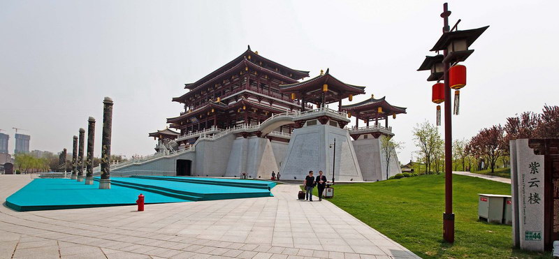 紫云樓位于大唐芙蓉園的中心位置,是全園最主要的仿唐建筑組群之一,并且它也是全園的點睛之樓。