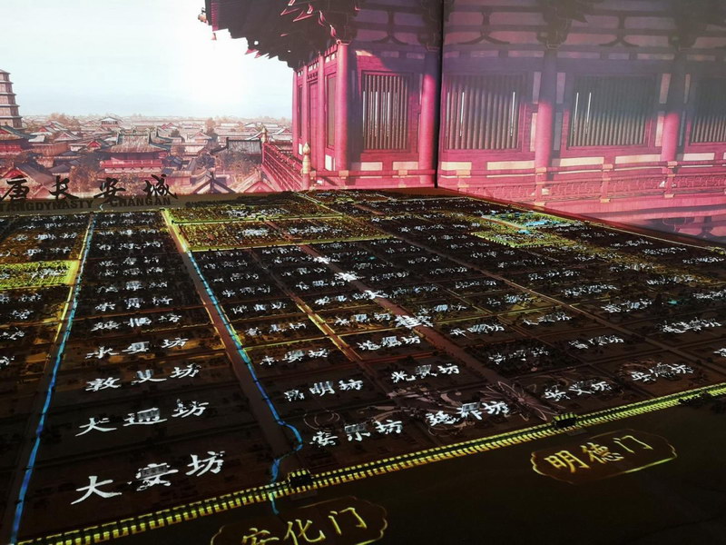 利用沙盤上建筑模型與沙盤三面電動幕,贏康為其打造了沉浸式立體沙盤互動投影秀。整個沙盤演出實現(xiàn)了建筑模型與投影畫面的一一對應(yīng),相互映襯、無縫融合,讓人如臨其境,猶如“進入”長安城街道,感受盛唐的巍峨、繁盛、大氣與恢宏。