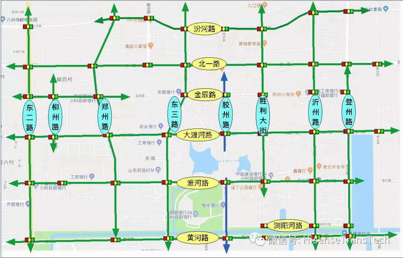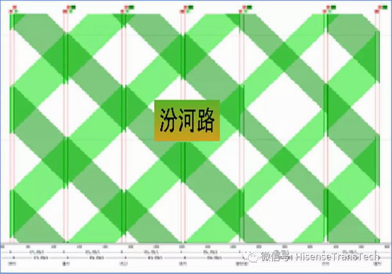 在今年,海信協(xié)助東營交警,在東營市中心城區(qū)依靠特有的路網(wǎng)結(jié)構(gòu)以及穩(wěn)定的交通流等優(yōu)勢,打造了獨有的大規(guī)模區(qū)域綠波控制,即該區(qū)域內(nèi)車輛橫向行駛或縱向行駛均有綠波協(xié)調(diào)效果。我們將這種協(xié)調(diào)控制方式稱為“綠網(wǎng)”。
