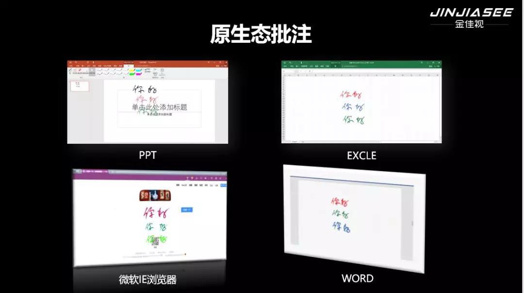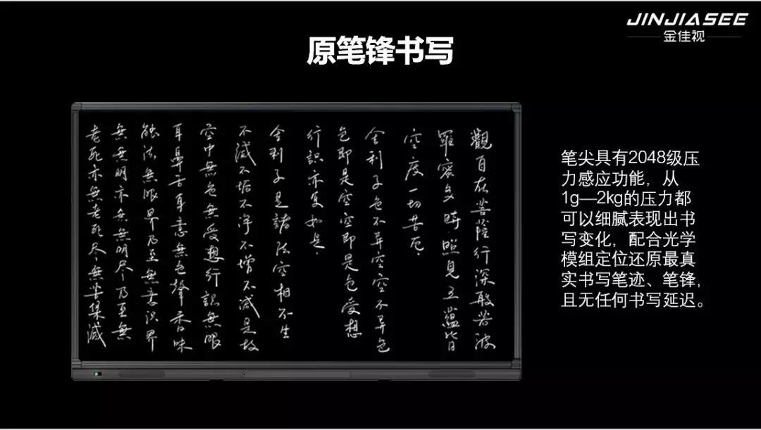 聯(lián)合品牌金佳視更是推出“金佳視交互式真跡觸控一體機”創(chuàng)新的光學(xué)觸控、真跡書寫,原生態(tài)批注等功能,在行業(yè)內(nèi)處于技術(shù)領(lǐng)先地位。更是打破傳統(tǒng)會議機、教育機分版本問題做到一款產(chǎn)品 | 兩種場景 | 十機合一| 百種配置 | 千般應(yīng)用 | 萬里挑一;