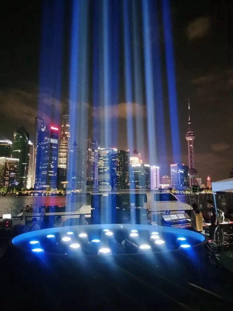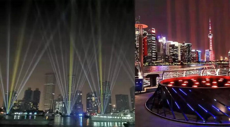 鴻彩燈光旗下的品牌樂華光電100多臺光束燈, 均勻的光束閃耀著五彩光芒,把上海北外灘映襯得更加的繽紛。
