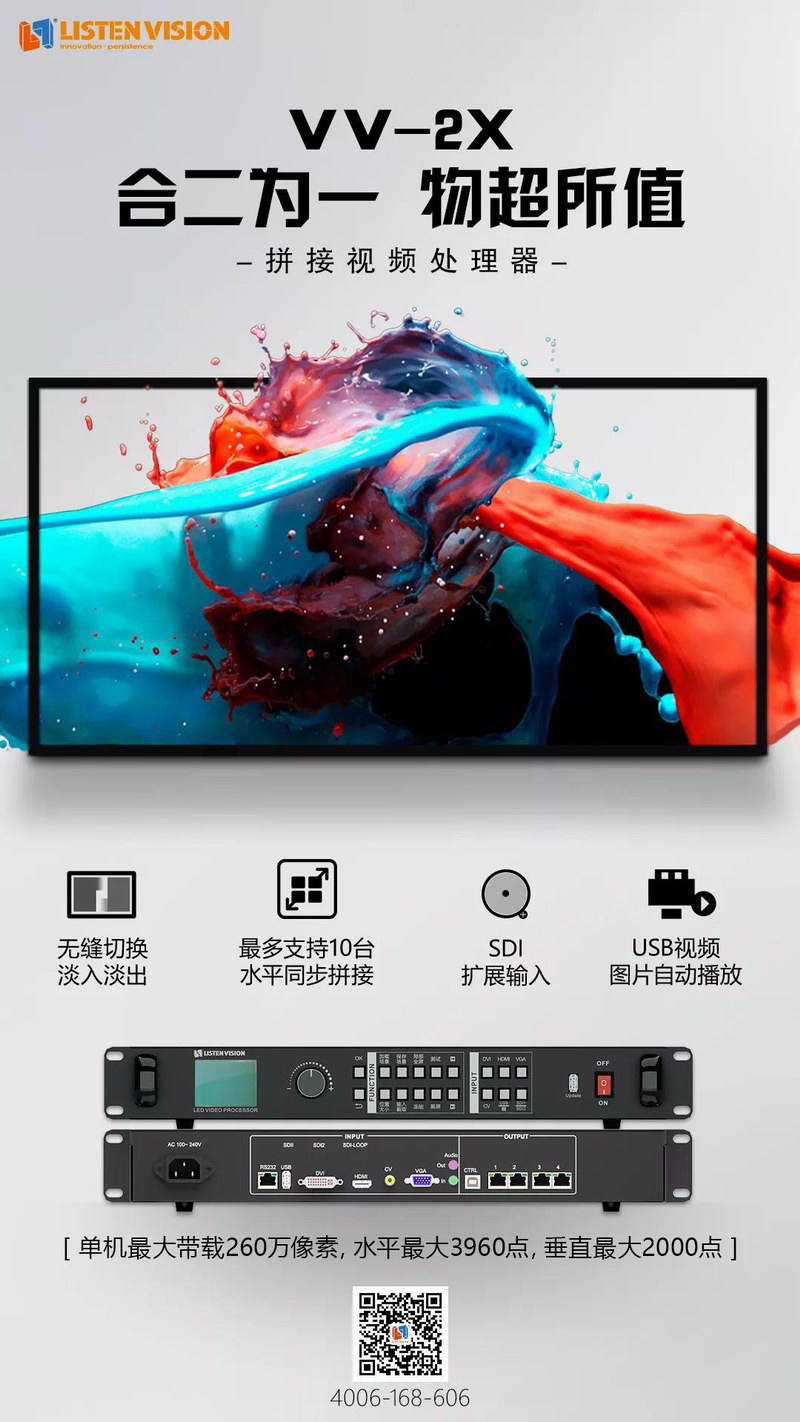 VV-2X是上海靈信視覺推出的一款高性價比視頻處理器,擁有 7個輸入接口,最大帶載 260 萬像素,并支持USB自動播放,與LED顯示屏相結(jié)合,實現(xiàn)不同顯示尺寸、音視頻結(jié)合、同異步顯示、靈活分割組合畫面等優(yōu)勢,滿足各種會議屏、監(jiān)控大屏的使用需求。