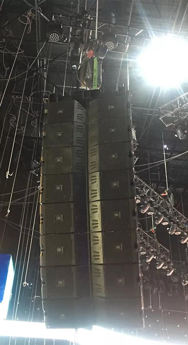 本次錄制使用20只JBL VTX線陣列揚(yáng)聲器搭配SOUNDCRAFT數(shù)字調(diào)音臺(tái),舞臺(tái)兩側(cè)主擴(kuò)聲各使用了8只雙10英寸JBL VTX V20全新線陣列揚(yáng)聲器,吊掛的高度約8米,使聲音從空間上可以完整均勻的覆蓋全部觀眾席;舞臺(tái)臺(tái)口兩側(cè)各落地?cái)[放2只JBL VTX S25超低音揚(yáng)聲器;保證了所有觀眾席的位置都能清晰的聽音,且音色平滑細(xì)膩。