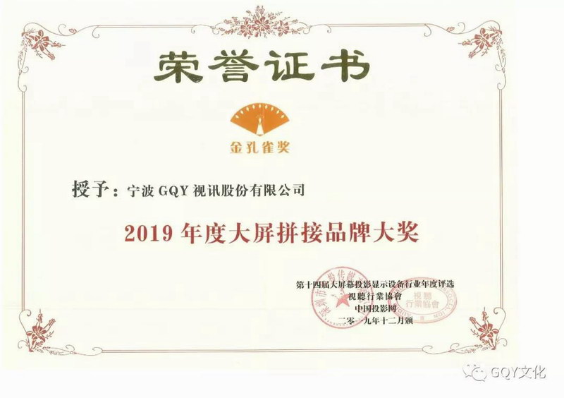 2019視聽行業(yè)高峰論壇暨金孔雀頒獎(jiǎng)盛典于12月20日在深圳圣廷苑酒店隆重舉行。作為視聽行業(yè)最具權(quán)威性的行業(yè)論壇以及頒獎(jiǎng)盛典,在現(xiàn)場六百余名與會(huì)者的共同見證下,GQY榮獲了視聽行業(yè)協(xié)會(huì)與中國投影網(wǎng)共同頒發(fā)的3項(xiàng)金孔雀大獎(jiǎng),分別是“2019年度小間距LED品牌大獎(jiǎng)”、“2019年度大屏拼接品牌大獎(jiǎng)”、“2019年度LED藝術(shù)創(chuàng)新獎(jiǎng)”。