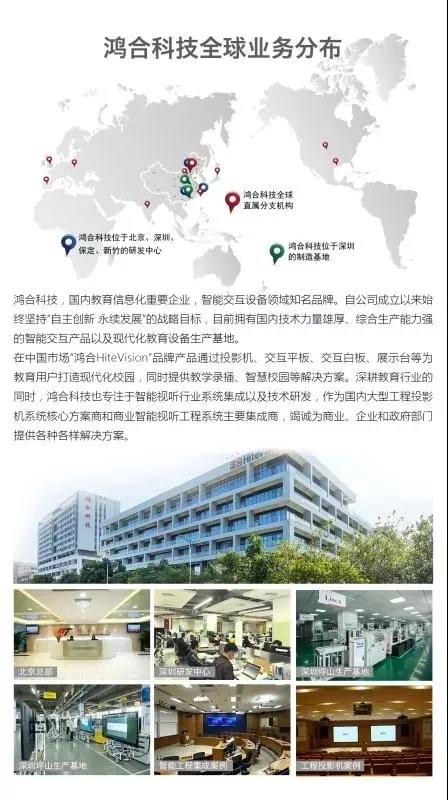 鴻合HiteVision品牌產(chǎn)品透過投影機(jī)、交互平板、交互白板、展示臺等為教育用戶打造現(xiàn)代化校園,同時(shí)提供教學(xué)錄播、智慧校園等解決方案以及K12數(shù)字教學(xué)資源和教育云平臺等服務(wù)。深耕教育行業(yè)的同時(shí)鴻合科技也專注多媒體視訊行業(yè)系統(tǒng)集成以及技術(shù)研發(fā),作為國內(nèi)大型工程投影機(jī)系統(tǒng)核心方案商和商業(yè)智能視聽工程系統(tǒng)主要集成商竭誠為商業(yè)、企業(yè)和政府部門提供各種各種解決方案。