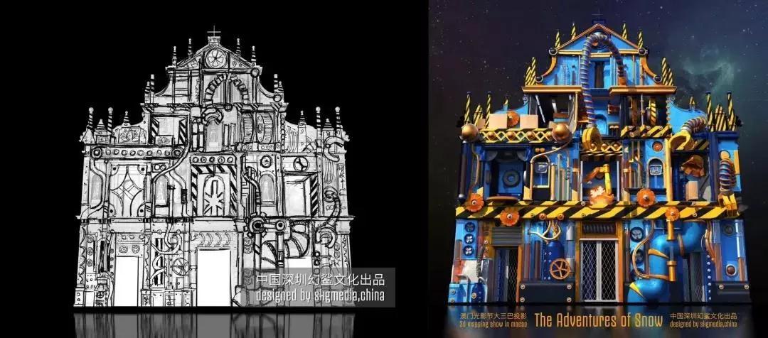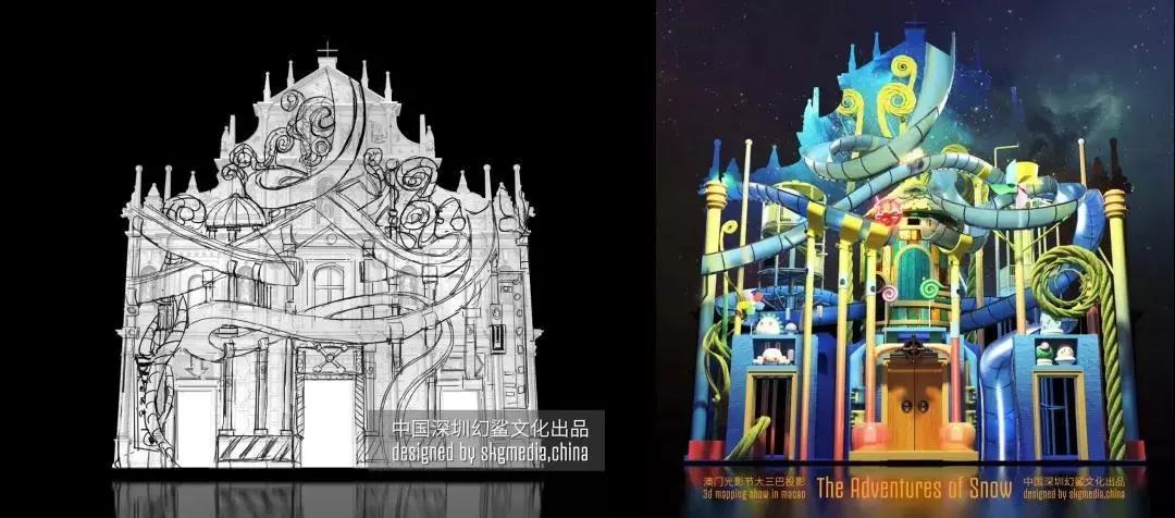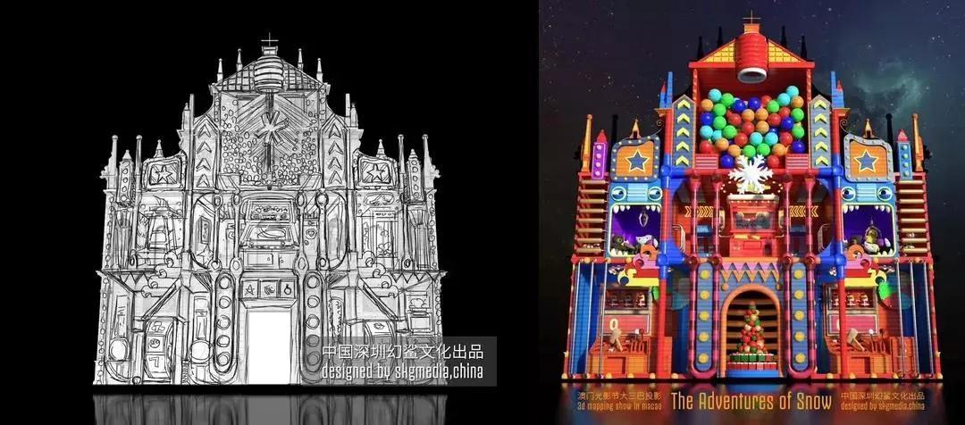 光雕作品《小雪花歷險記》在建模階段,因地制宜,結(jié)合墻面結(jié)構(gòu),融入當(dāng)?shù)匚幕剩缺壤O(shè)計,突出建筑與投影的美妙之處!