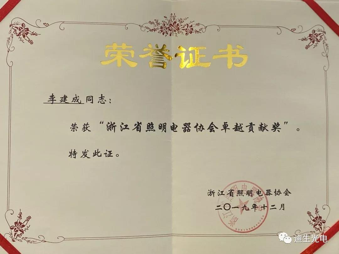 作為行業(yè)發(fā)展的積極建設者和有力推動者,浙江迪生光電一舉攬獲“浙江省照明電器協(xié)會優(yōu)秀會員單位、最佳合作伙伴”、迪生光電董事長李建成榮獲“浙江省照明電器協(xié)會卓越貢獻獎”、企業(yè)申報的“瑤琳仙境溶洞夜游亮化提升工程”項目榮獲“2019年度浙江照明獎十大創(chuàng)新工程獎”,共計獲得協(xié)會授予的四個重要獎項。