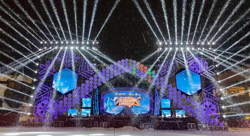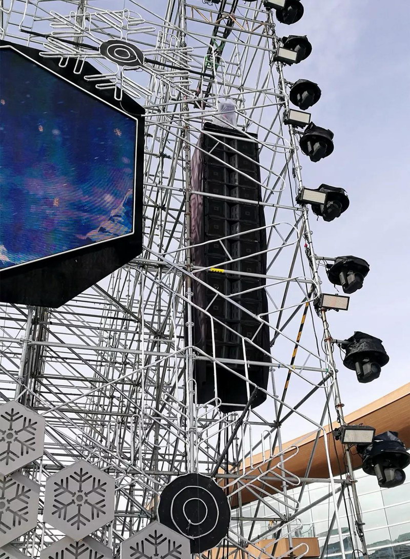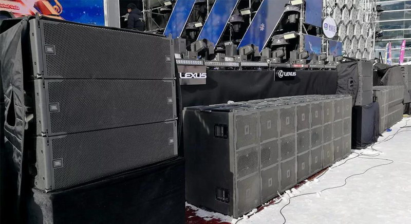 為更好的渲染現(xiàn)場(chǎng)氣氛,擴(kuò)聲系統(tǒng)特別使用由北京世紀(jì)德天文化傳媒有限公司提供的JBL VTX 系列揚(yáng)聲器。采用24只JBL VT4888全頻揚(yáng)聲器分為左右兩組吊掛在舞臺(tái)兩側(cè);24只JBL VTX S28和VT4880超低音揚(yáng)聲器分三組擺放在舞臺(tái)下方; 12只JBL VTX A12分為四組作為中置揚(yáng)聲器,整套擴(kuò)聲系統(tǒng)充分展現(xiàn)冰雪與搖滾激情碰撞。