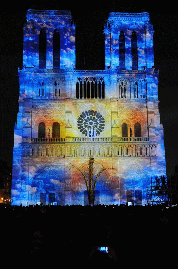 Bruno Seillier通過聲、光、影的表現(xiàn)手法,在圣母院的外墻上投射出了這17幅不同風格的3D影像。