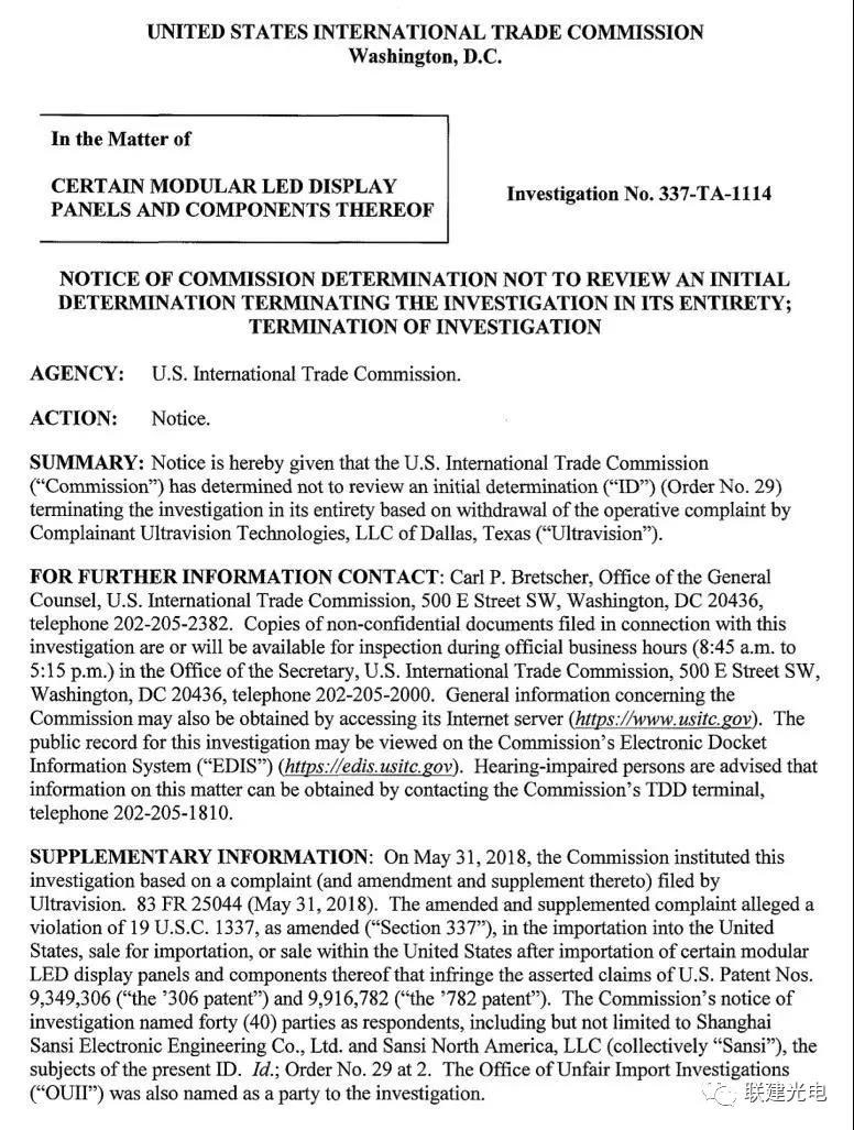 2019年2月21日,美國國際貿(mào)易委員會(ITC)發(fā)布公告稱,對涉華特定模塊化LED顯示面板及其組件(CERTAIN MODULAR LED DISPLAY PANELS AND COMPONENTSTHEREOF,調(diào)查編碼:337-TA-1114)作出337調(diào)查部分終裁:對本案行政法官于2019年1月31日作出的初裁(Order No. 29)不予復(fù)審,即基于申請方提出的撤回申請,整體終止本案調(diào)查(TERMINATING THE INVESTIGATION IN ITS ENTIRETY)。至此,經(jīng)過長達(dá)一年的艱苦卓絕的努力,以聯(lián)建光電為代表的中國LED屏企在“337調(diào)查”中取得了重大的勝利