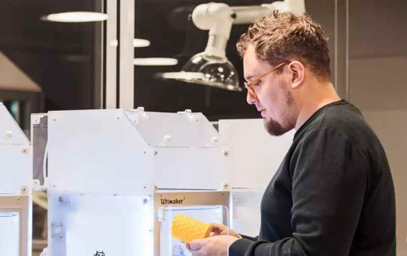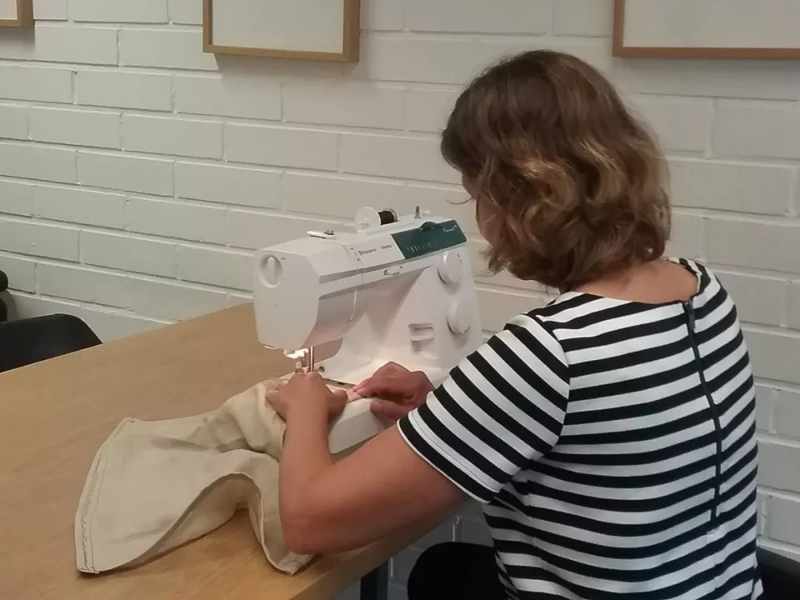 工作臺上放有縫紉機(jī)、胸章機(jī)、3D打印機(jī)、