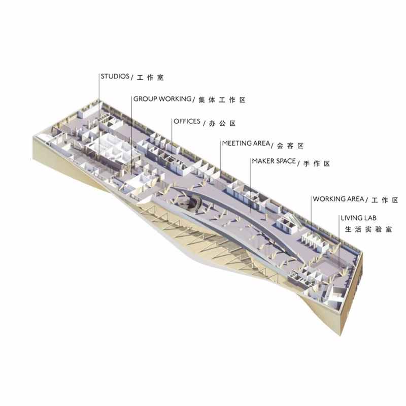 二樓在橋梁桁架之間靈活設(shè)置了很多小房間,