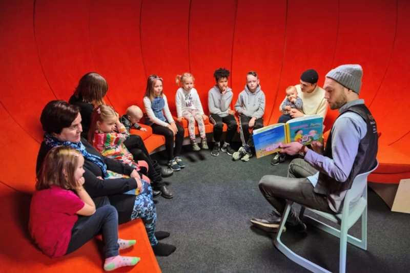 到橘色閱讀室里,聽媽媽講故事。