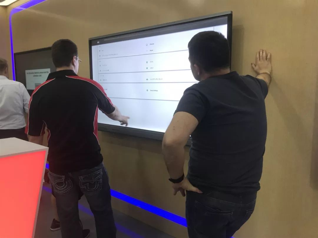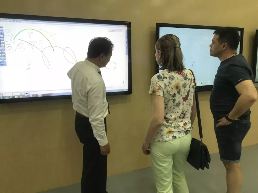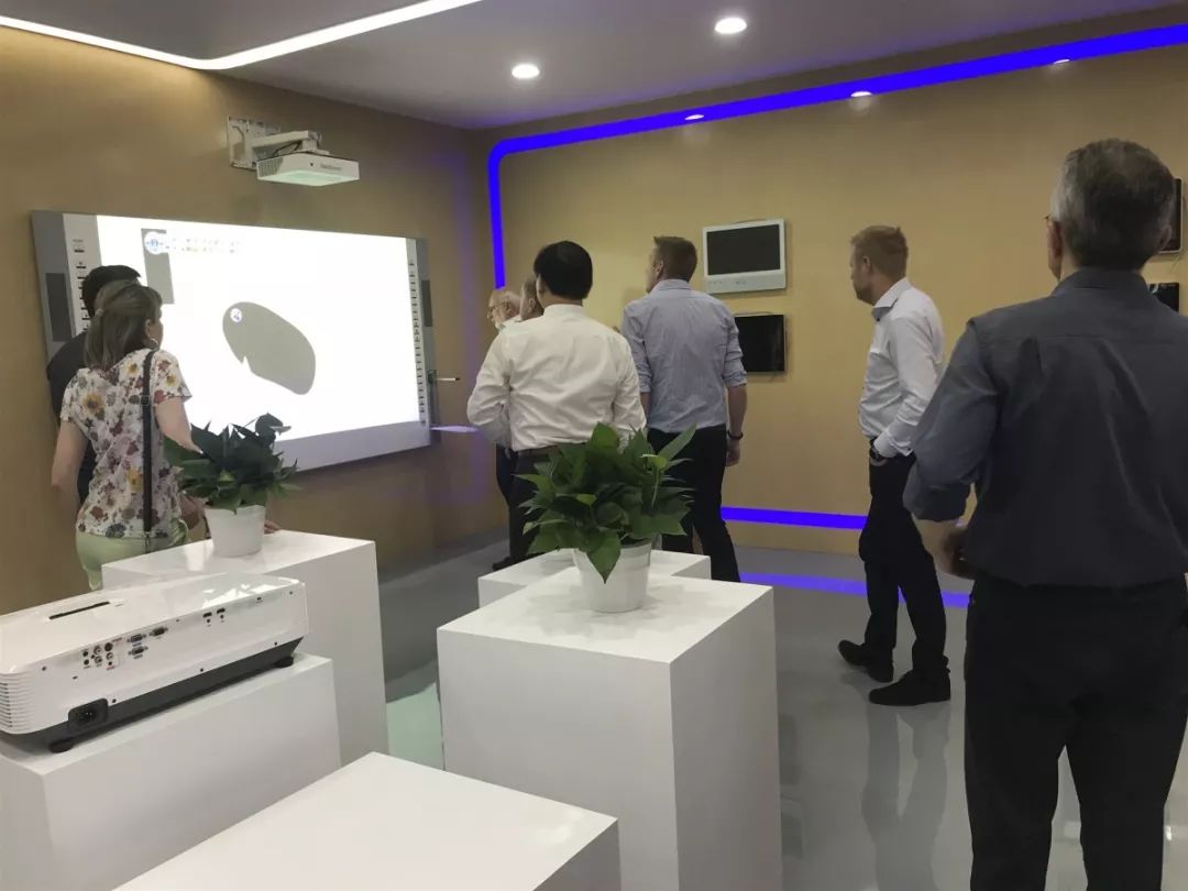 在參觀期間,歐洲同事對公司產(chǎn)品的實用性及操作性非常感興趣,由外貿(mào)經(jīng)理依次對產(chǎn)品給他們進行了詳細的講解。從紅外觸摸方案與電容觸摸方案的對比,到電子白板、觸摸一體機、白板一體機、激光投影機等產(chǎn)品的演變歷程、功能、特性的介紹,最后對大家提出的問題進行了一一解答。