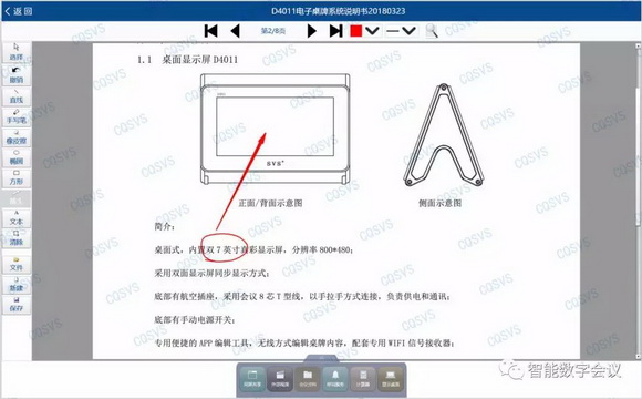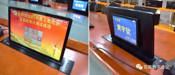 1. SVS無紙化會議系統(tǒng)硬件上配置了高清超薄液晶屏升降設(shè)備,這個液晶屏與一般普通辦公用的顯示屏可不一樣,它采用的是雙面屏設(shè)計(jì),前面的主屏顯示會議內(nèi)容,IPS全視角顯示,支持多點(diǎn)觸摸操控,經(jīng)過筆者體驗(yàn),在17寸的觸摸屏上操作還挺靈敏,能很快上手適應(yīng)。該顯示屏背面還配有一個10寸桌牌副屏,主要顯示參會人員的姓名、職位等信息,桌牌整體顯示醒目,而且后臺信息編輯方便,可統(tǒng)一修改格式字體等,電子化桌牌替代了傳統(tǒng)的紙質(zhì)桌牌,彰顯科技環(huán)保。