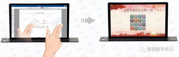 2. 系統(tǒng)還支持手勢觸摸控制顯示屏畫面切換,在其他參會者分享的同屏畫面和自身的畫面之間我們可以通過雙指觸摸滑動來實(shí)現(xiàn)輕松切換,盡享科技帶來的便捷會議之樂趣。體驗(yàn)到這里,筆者不由的驚呼,這正是我們需要的高效率、先進(jìn)性的智能無紙化會議啊!