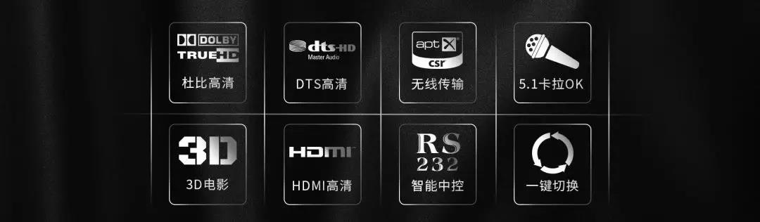 該系列音響采用目前最先進的Dolby Atmos音頻技術和4K超清視頻技術,結合無線傳輸技術,組成真正的5.1.2全景聲音視頻解決方案。后置環(huán)繞采用無線傳輸方式,頂置聲道安置在環(huán)繞音箱頂部,通過天花板反射形成天空頂置聲道;整個聲場按照杜比實驗室標準的處理算法來增加空間包圍感,讓觀影者輕松感受到全包圍的震撼“3D音效”。