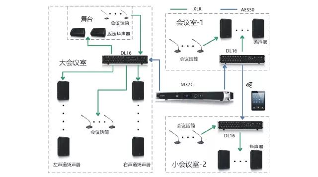 M32C具有雙AES50網(wǎng)絡(luò)接口,最大可擴(kuò)展到96個輸入和96個輸出。根據(jù)會議室音頻信號的傳輸通道需求,可將DL16/DL32分別配接在兩個不同的會議室,僅通過兩根cat5類網(wǎng)線便能實現(xiàn)兩個會議室的集中控制。通過ipad等應(yīng)用軟件進(jìn)行混音和信號分配,并且M32C允許多臺應(yīng)用設(shè)備接入控制,可用兩個ipad分別控制兩個會議室。M32C前面板配備A類USB插口用于音頻和數(shù)據(jù)傳輸,可實現(xiàn)會議錄音功能,導(dǎo)出導(dǎo)入wav音頻格式文件。