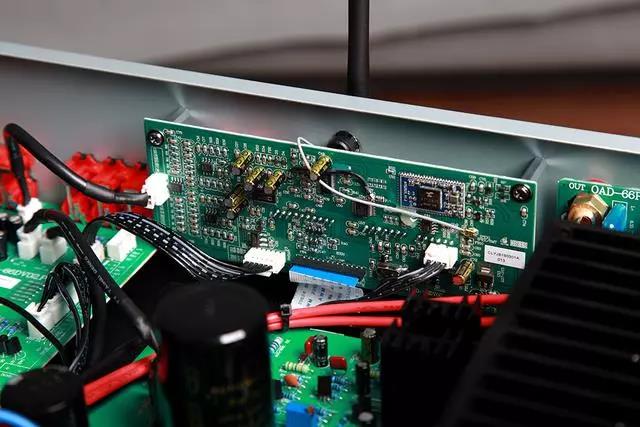 打開該機(jī)的上蓋板仔細(xì)查看:整體電路設(shè)計為四大部分:分別是信號輸入/數(shù)字解碼電路板、主體功放電路板和供電電源板以及面板的液晶顯示電路板。其中電路升級部分主要就集中在信號輸入數(shù)字解碼板上,仔細(xì)觀察,該電路板上集中安裝了以ATS2825芯片為首的藍(lán)牙模塊,內(nèi)置DSP支持多種音效處理,大容量的RAM能夠滿足不同藍(lán)牙應(yīng)用方案的需求,并且支持后臺藍(lán)牙,在播放外置SD卡或U盤中高品質(zhì)音樂的同時也可以保持藍(lán)牙連接狀態(tài)。