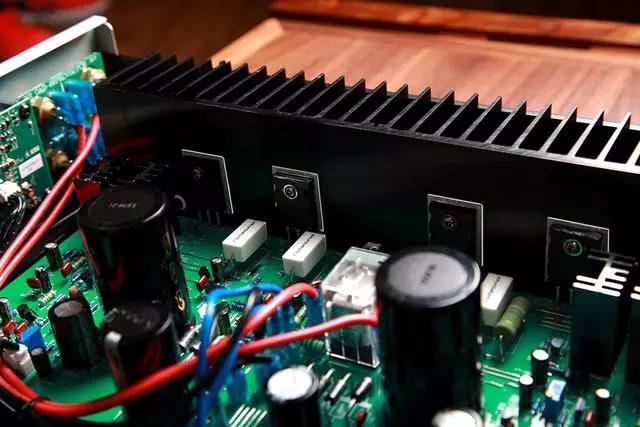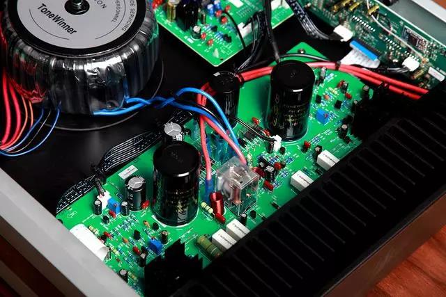 主功放電路集中在機(jī)器右側(cè)那塊面積最大的電路板上,從該機(jī)的印板上的電路布局來看,該板是將來至前級電路的小信號輸入(含數(shù)/模轉(zhuǎn)換DAC解碼和電子音量調(diào)整后)的音頻信號進(jìn)一步擴(kuò)流并將功率放大,去推動揚(yáng)聲器發(fā)音。這種將前后級電路板分開設(shè)計手法,是為了杜絕大電流后級電路可能對弱信號的前級產(chǎn)生干擾而造成信噪比低的弊端,講究!