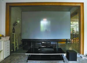 其搭配的一塊類似液晶顯示面板的超大顯示屏,叫做“玄烏冷屏”,100英寸的大小相當(dāng)于一臺(tái)55英寸液晶電視4倍左右的感覺,占據(jù)了墻面的大部分空間,因此,面積小的家庭恐怕有點(diǎn)hold不住。屏幕厚度僅10mm,整體由一塊軟屏和邊框、架子組成,高度超過1米,寬度超過2米,好像一個(gè)巨大的畫畫板。屏幕下方設(shè)有電視桌,可以放置投影儀等設(shè)備。