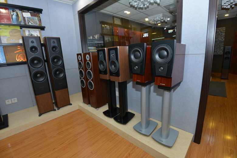 一面墻,擺滿了丹拿和達尼的熱銷產(chǎn)品:丹拿焦點FOCUS XD系列、丹拿意境EMIT系列、達尼OPTICON歐典系列、達尼DALI MENUET皇太子等,從書架箱到落地箱,玲瑯滿目。
