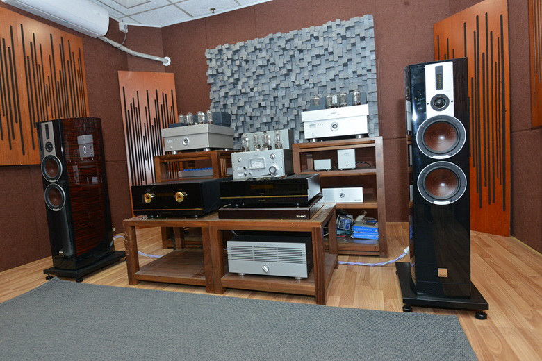 大家都知道丹拿Hi-End級別的音箱解析力超強,加之低頻動態(tài)速度快,非常考驗后級的速度和聲音素質(zhì),因此很多用戶都認為不好搭配。樂頌坊這里搭配方面十分講究,除了使用同級別的Hi-End級別的發(fā)燒銘器外,器材的推動方式也十分講究:首先是美國ARC( Audio Research)CD6 數(shù)字轉(zhuǎn)盤和Reference 5SE前級作為音源,高中音喇叭單元由丹麥貴豐Antileon EVO 后級推動,而對于難度較大的丹拿C2和旗艦Evidence Temptation的低頻喇叭單元,則采用4只PASS旗艦X1000.5推動。這樣一套系統(tǒng),不算前級,足足使用了5只后級來保證它的潛力能夠完全釋放——搭配的好。