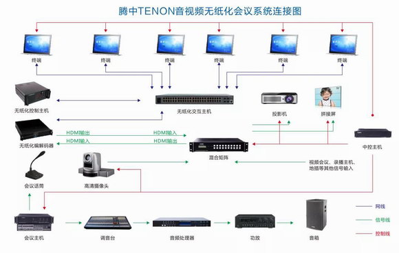 根據(jù)用戶的使用需求,本次會(huì)議室設(shè)計(jì)一套無(wú)紙化會(huì)議系統(tǒng),根據(jù)會(huì)議室的布局,在會(huì)議室每個(gè)座位設(shè)計(jì)一臺(tái)液晶升降一體機(jī),一臺(tái)桌牌升降一體機(jī),安裝無(wú)紙化軟件;同時(shí)設(shè)計(jì)一臺(tái)無(wú)紙化控制主機(jī),作為系統(tǒng)的管理和控制中心,無(wú)紙化平板電腦通過(guò)無(wú)線網(wǎng)絡(luò)與無(wú)紙化控制主機(jī)連接,組成一套完整的智能交互式無(wú)紙化會(huì)議系統(tǒng)。