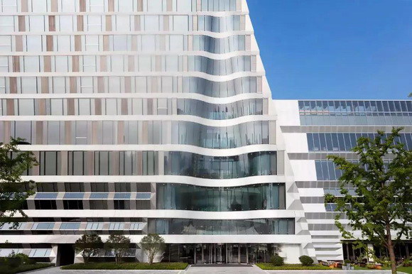 酒店整體設計以水為元素,極盡建筑與光影、色彩之變幻。酒店外觀采用中庭坡面和裙樓的漸收斜面的方式,將項目重新定義為一個完整的組合,以傲人的姿態(tài)屹立在上海的天際線上。