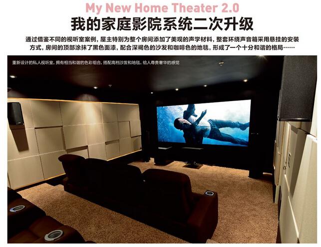 通過借鑒不同的視聽室案例,屋主特別為整個房間添加了美觀的聲學材料,整套環繞聲音箱采用懸掛的安裝方式,房間的頂部涂抹了黑色面漆,配合深褐色的沙發和咖啡色的地毯,形成了一個十分和諧的格局……
