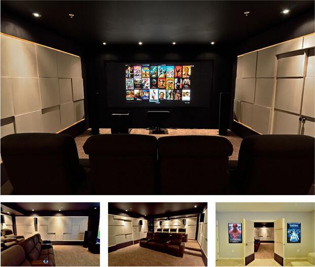 左 視聽室的大門、內飾、燈光照明都進行了大范圍的更新,針對房間的聲學特性,屋主專門訂做了一批聲學材料