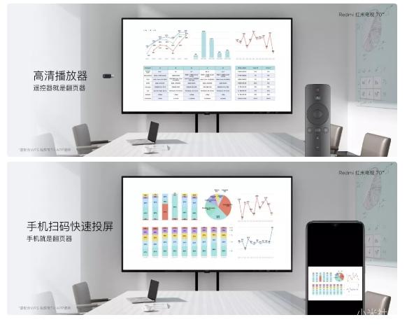 大屏辦公更高效,無(wú)需通過(guò)HDMI連接筆記本電腦,通過(guò)U盤(pán)就可開(kāi)啟會(huì)議,docx .xlsx .pptx .pdf 等主流辦公⽂件格式,均可流暢展示,遙控器就是翻頁(yè)器;還可通過(guò)小米筆記本電腦(含Redmi筆記本電腦)和小米手機(jī)(含Redmi紅米手機(jī))實(shí)現(xiàn)快速投屏。支持其他品牌的手機(jī)通過(guò)WPS Office掃碼快速投屏,將文檔分享到電視上。