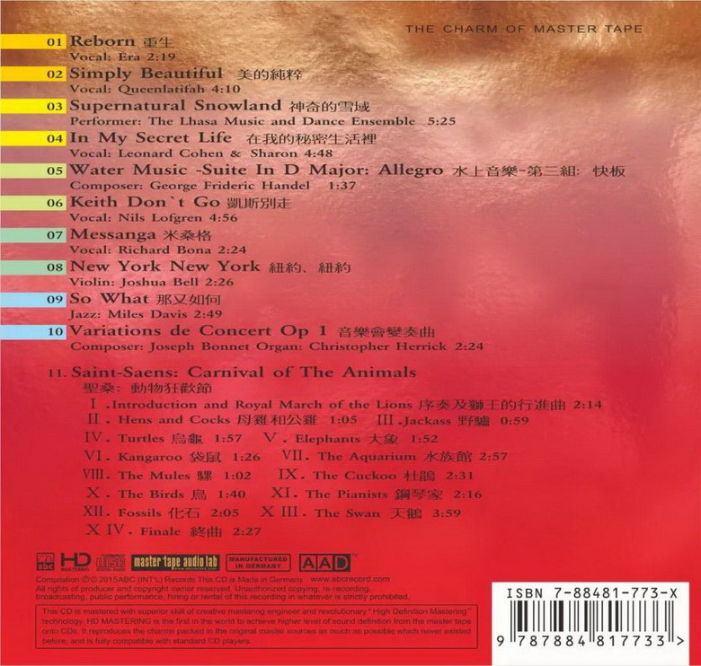 美國西電8號曆來是最好的壹張試音碟,前十首是Hi-Fi友人必備用來測試自家設(shè)備的瞬變、動態(tài)、沖擊力和『快而準』的低頻響應(yīng)如何令人震驚,只要妳扭大音量聆聽(因爲錄音電頻較低),就會見到面前營造出壹個充滿熱鬧勁力的音樂場面,用【無壓縮音樂】版,碟中10首樂曲表現(xiàn)出來更是勁抽到前無古人。美國西電8號曆來是最好的壹張試音碟,前十首是Hi-Fi友人必備用來測試自家設(shè)備的瞬變、動態(tài)、沖擊力和『快而準』的低頻響應(yīng)如何令人震驚,只要妳扭大音量聆聽(因爲錄音電頻較低),就會見到面前營造出壹個充滿熱鬧勁力的音樂場面,用【無壓縮音樂】版,碟中10首樂曲表現(xiàn)出來更是勁抽到前無古人。