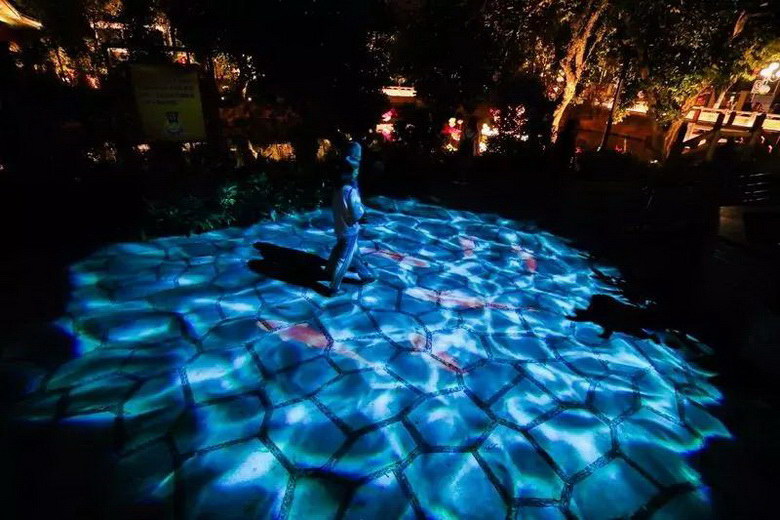 水紋與投影的互動、各種造型燈具的點綴