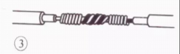 將兩根雙芯線線頭剖削成圖示中的形式。連接時(shí),將兩根待連接的線頭中顏色一致的芯線按小截面直線連接方式連接。用相同的方法將另一顏色的芯線連接在一起。
