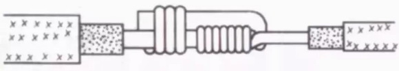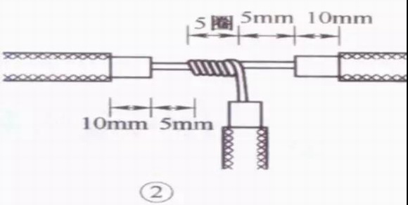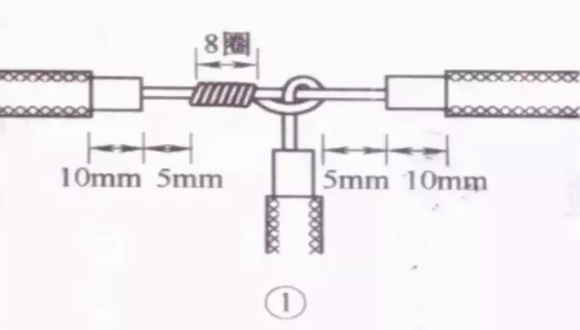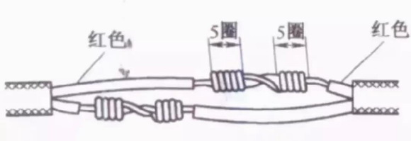 把細(xì)導(dǎo)線線頭在粗導(dǎo)線線頭上緊密纏繞5~6圈,彎折粗線頭端部,使它壓在纏繞層上,再把細(xì)線頭纏繞3~4圈,剪去余端,鉗平切口。