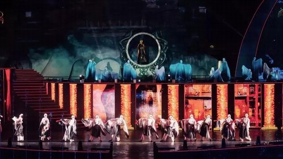 在舞臺燈具選擇上,使用了1400W切割燈和1400W染色燈做為主要燈具用于大面積染色和各區(qū)域照明,其優(yōu)點是顯色指數(shù)高,光通量高,非常適用于戶外遠距離投光染色。另外采用470W三合一燈具作為局部氛圍效果燈具。除此以外,還沿著整個水舞臺周圍還運用了45℃的條形染色燈作為水面染色和演員的氛圍烘托。為了讓海難場面的一幕更加逼真,在全場觀眾背后的最高點設計了16臺大功率白光頻閃,配合環(huán)繞音效模擬風暴雷電效果,給觀眾一種置身其中的感覺。