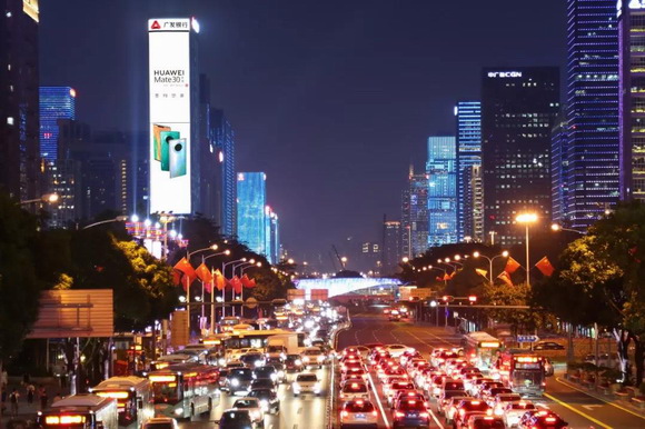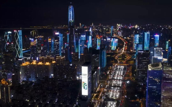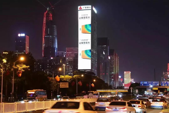 戰(zhàn)場外,華為更是不惜重金投放在各大城市的戶外地標屏。15城地標聯(lián)動的場景牢牢抓住消費者的眼球,被網(wǎng)友戲稱為"千億營銷"