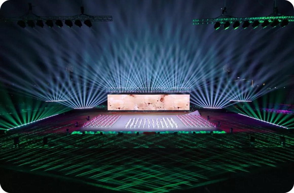 黃岡市第五屆運動會開幕式在蘄春縣奧體中心體育場舉行,開幕式燈光使用了歐瑪LED切割燈(ARES-P7II)64臺;其中面光32臺,逆光32臺,三合一電腦燈(Moore380)100臺;LED蜂眼染色燈(Eos-B19)100臺。