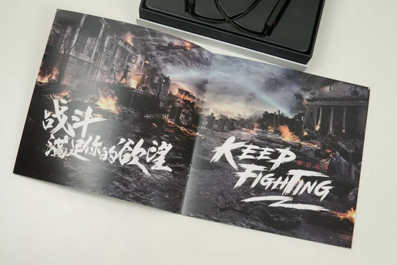 打開盒子第一眼看見的不是耳機(jī)本體而是一本游戲小冊子,里面有游戲插畫還有這款耳機(jī)的設(shè)計(jì)手稿,還是很用心的,這“不服來戰(zhàn)”四個(gè)字讓人看得立刻有“戰(zhàn)斗”激情了,想立刻打開和平精英打上兩局,但是,還是先看東西吧。