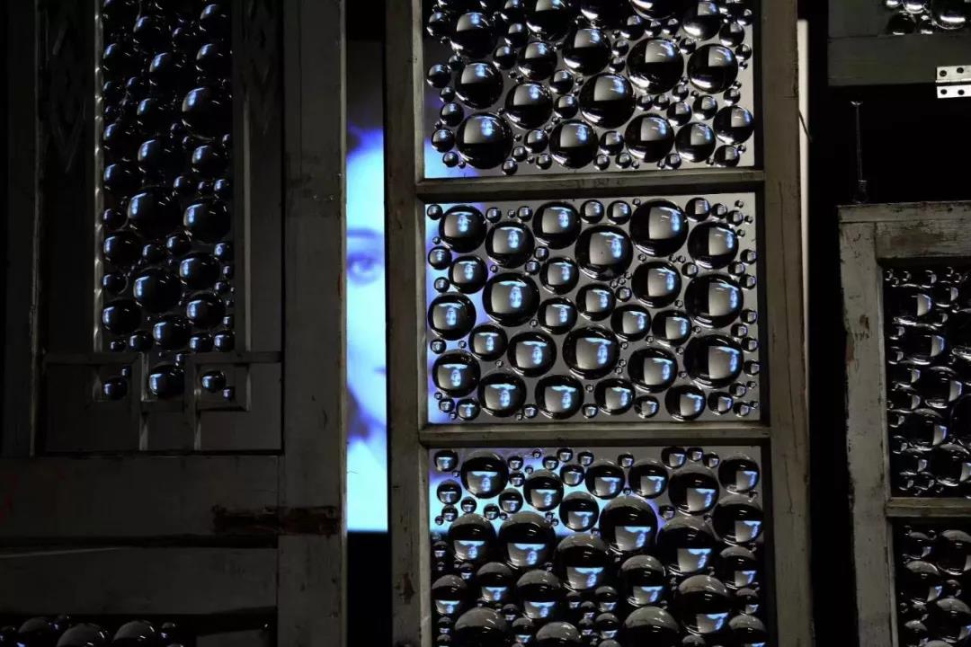 不算空蕩的房間,黑漆漆的墻,還有復(fù)古的窗,上面粘滿一顆顆凸起的玻璃,透射著同一個(gè)畫面,有人、有眼,像置身在另外一個(gè)世界,有著迷幻、空洞卻充滿故事的感覺。
