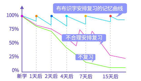 眾所周知,大腦是會遺忘,但是遺忘有規(guī)律可循。實驗證明,及時記憶,可以抓住記憶的最好時機。布布識字的學習過程便是在遵循艾賓浩斯記憶曲線規(guī)律的基礎上,通過布布識字研發(fā)的學習方法,在學習漢字的第一天、第二天、第四天等關鍵記憶節(jié)點,進行充分有效的復習,在每個漢字即將達到臨界點的時候,恰到好處的安排孩子的下一次復習。