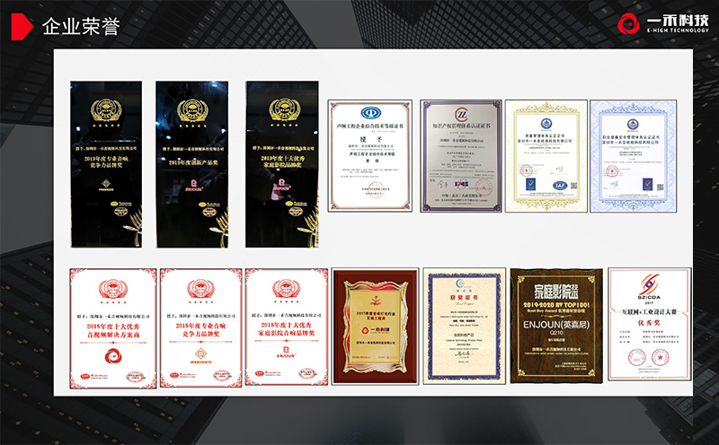 作為智能家庭影院的先驅(qū)者,ENJOUN英嘉尼從2009年成立至今,一直致力于智能家庭影音產(chǎn)品的研發(fā)、生產(chǎn)和銷售,十年如一日,堅(jiān)持只做好一件事情,以“聲音與藝術(shù)的融合”的設(shè)計(jì)理念和“讓愛(ài)回家”的文化理念,從科技感的外觀設(shè)計(jì),高品質(zhì)的音效追求,一體化的功能,便捷的安裝,簡(jiǎn)易的操作,滿足現(xiàn)代家庭娛樂(lè)生活的的高品質(zhì)需求出發(fā),匠心打造出了一系列優(yōu)質(zhì)智能家庭影音產(chǎn)品。至今產(chǎn)品已獲得55項(xiàng)發(fā)明專利、實(shí)用新型專利、外觀專利及軟件著作權(quán)。英嘉尼連續(xù)多年榮獲十大優(yōu)秀智能影院品牌獎(jiǎng),創(chuàng)新藍(lán)點(diǎn)獎(jiǎng),優(yōu)秀推薦獎(jiǎng)等。目前,英嘉尼在全國(guó)已擁有200多家體驗(yàn)店,產(chǎn)品應(yīng)用案例遍布全國(guó),深受廣大家庭用戶的認(rèn)可與好評(píng)!