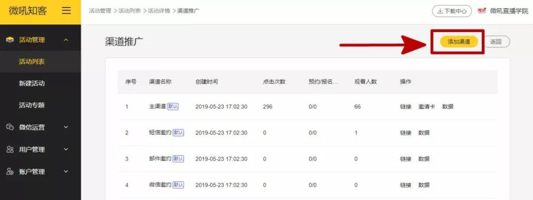 微吼知客新版本新增了【渠道管理】能力,不僅覆蓋了通用的郵件、短信、微信渠道,還可任意添加如企業(yè)官網(wǎng)、百度SEO等自定義渠道。更為重要的是,企業(yè)運營者添加的自定義渠道也將收集到用戶行為數(shù)據(jù)。