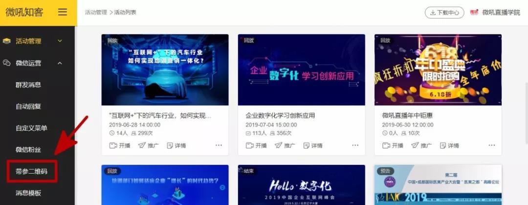 微吼知客新版本新上的【帶參二維碼】可謂神來之筆。帶參二維碼可統(tǒng)計不同員工帶來的微信粉絲關(guān)注量,還可根據(jù)不同的渠道來源,自動為粉絲打上標簽。