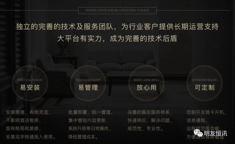 從智能影音硬件、影視內(nèi)容供應(yīng)、酒店管理系統(tǒng)定制、對接、顧客服務(wù)平臺構(gòu)建,為各行業(yè)客戶提供全方位、一站式的品質(zhì)服務(wù)。