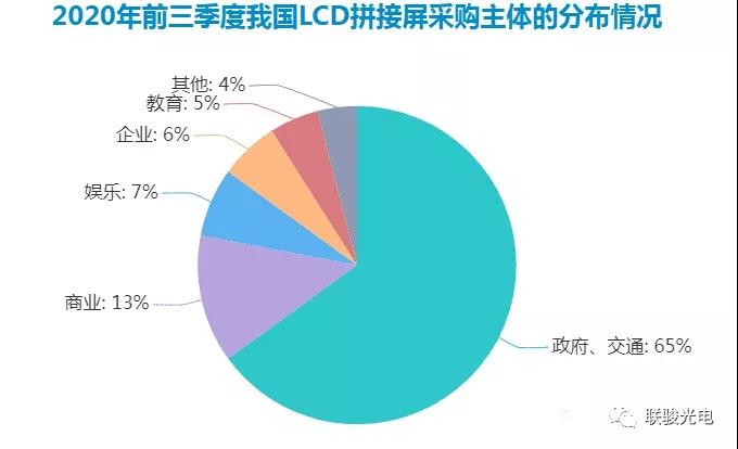 2020年前三季度,政府和交通采購量約占市場整體的65%。從拼接屏商用數(shù)據(jù)顯示來看,未來幾年,采購拼接屏的企業(yè)將逐年增長,拼接屏主要的客戶也會從原來的政府部門轉(zhuǎn)向市面上的各行各業(yè)。