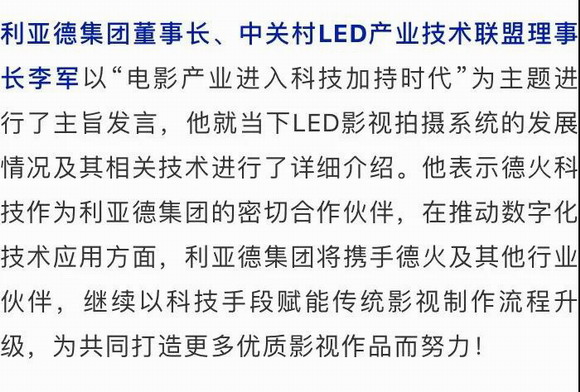 產(chǎn)品發(fā)布環(huán)節(jié),德火科技副總經(jīng)理樊乙對(duì)徳火科技自主研發(fā)的DRS-LED影視拍攝系統(tǒng)從技術(shù)層面進(jìn)行了精彩的產(chǎn)品發(fā)布,樊乙表示,LED數(shù)字沉浸式拍攝無(wú)疑是影視拍攝制作行業(yè)的又一次技術(shù)革新,德火科技的DRS-LED沉浸式影視拍攝系統(tǒng)擁有LED屏幕多角度三維縫合、大范圍紅外定位跟蹤等世界領(lǐng)先技術(shù),在較小的真實(shí)空間中打造出無(wú)限寬廣豐富多彩的沉浸式虛擬仿真環(huán)境,補(bǔ)充、擴(kuò)大場(chǎng)景的視覺(jué)效果,甚至能夠一定程度地幫助場(chǎng)景補(bǔ)光,將畫(huà)面自然度最大化,讓有限的空間實(shí)現(xiàn)無(wú)限的延展,讓虛擬畫(huà)面與現(xiàn)實(shí)畫(huà)面完美結(jié)合,實(shí)現(xiàn)虛擬和現(xiàn)實(shí)的交互,讓虛擬的環(huán)境成為真實(shí)場(chǎng)景的一部分,真正做到鏡頭內(nèi)外所見(jiàn)即所得,讓影視因此而無(wú)界。