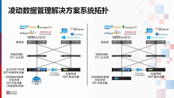 高,代表高性價比下的高性能、高可靠性。據(jù)聯(lián)想凌拓資深技術(shù)顧問婁辛研介紹,“凌動數(shù)據(jù)管理”解決方案配置了12塊960GB的SSD閃存盤,開啟存儲效率功能、8K 數(shù)據(jù)塊、80%隨機讀、20%隨機寫、小于 1ms 訪問延時,支持NFS 存儲協(xié)議,單套系統(tǒng)僅需2個線程就帶來了13萬IOPS的高性能。在可靠性上,解決方案擁有先進的數(shù)據(jù)保護技術(shù),在同一時間,任意故障 1 個控制器節(jié)點和3塊硬盤的情況下,可實現(xiàn)數(shù)據(jù)不丟失、業(yè)務不中斷。